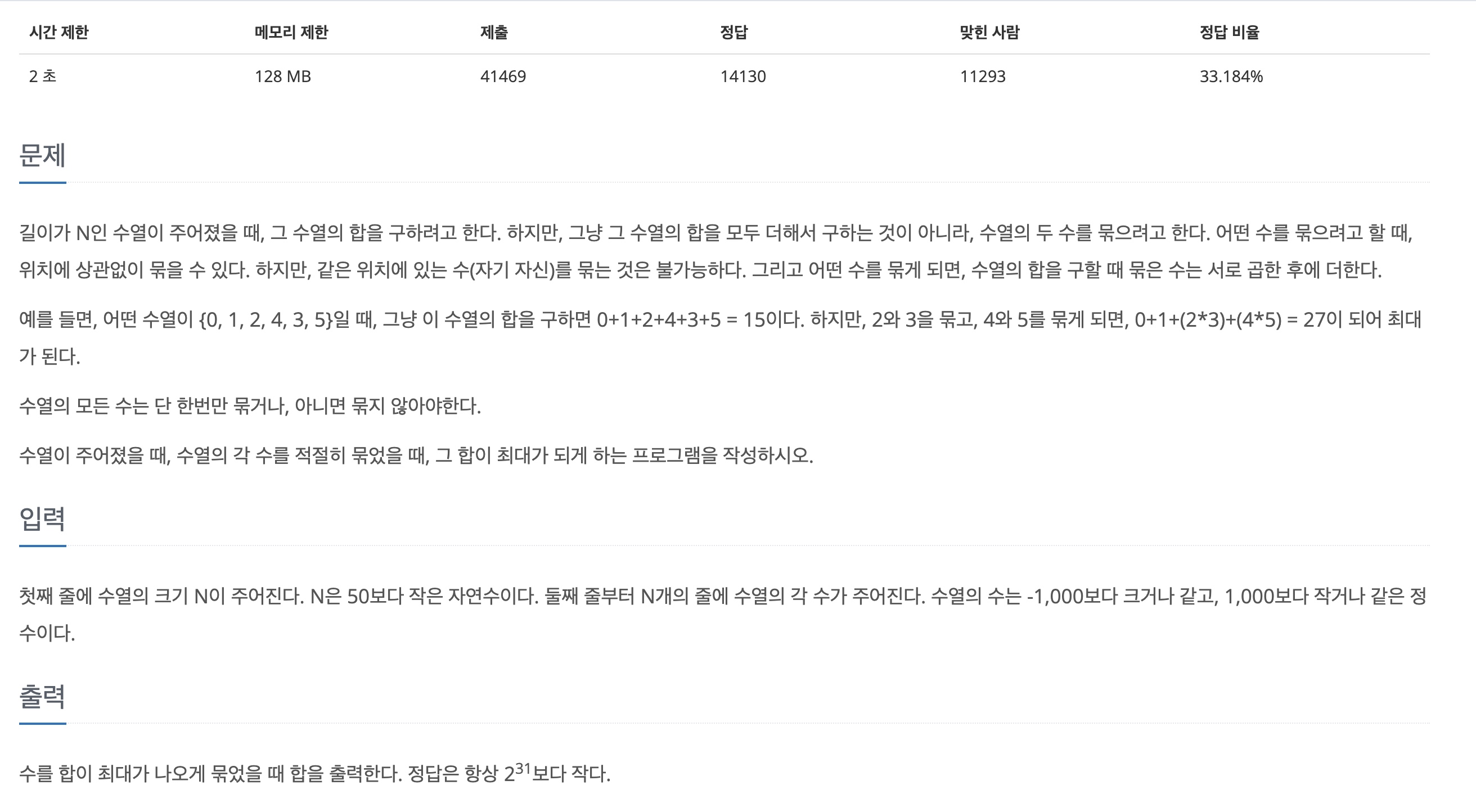 수를 적절히 묶었을 때의 합이 최댓값을 구해야하기 때문에 적절히 묶는 방법이 무엇일까를 고민하는 그리디 알고리즘이었습니다.